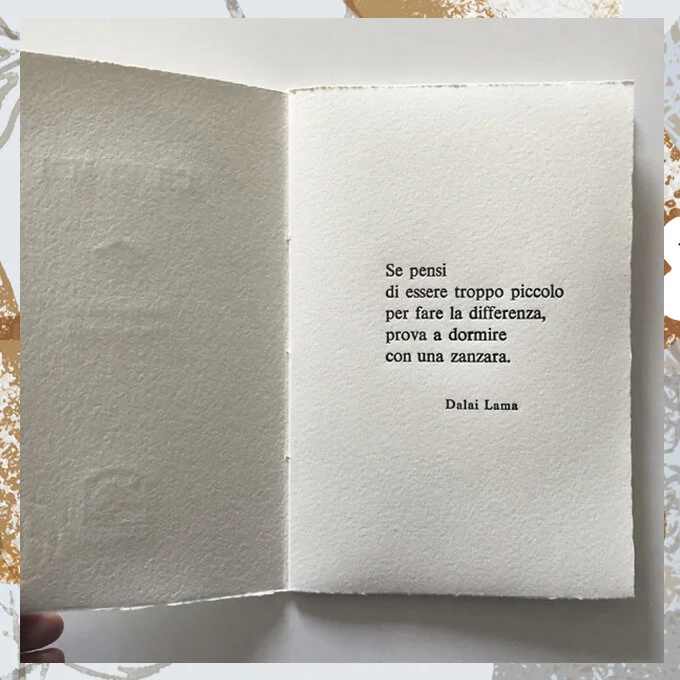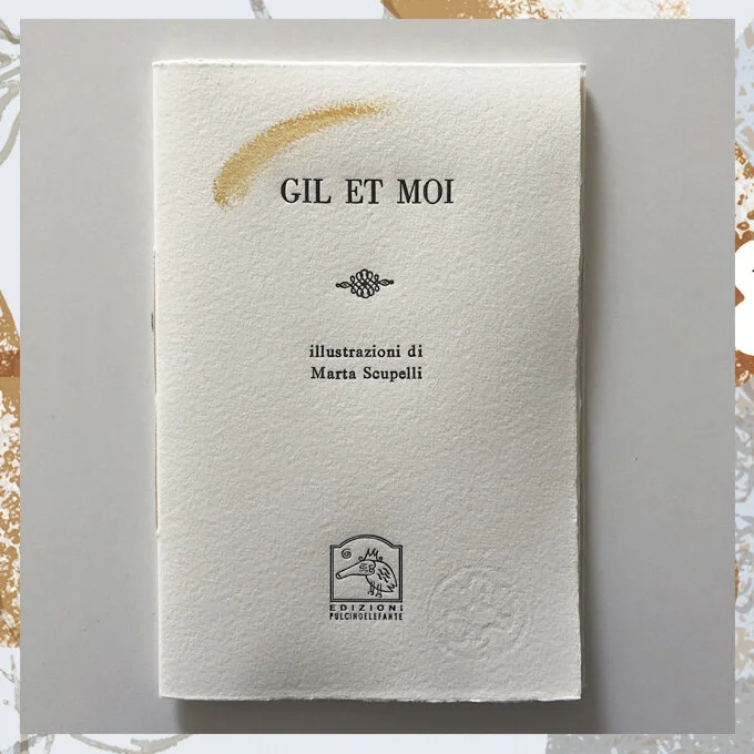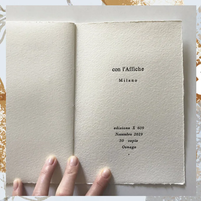 A "plaquette" made entirely by hands, using an exclusive german cotton paper and printing with movable types. The artwork inside is in a mixed technique in three different versions, realized with the artist Alberto Casiraghi. Published by Edizioni Pulcinoelefante.